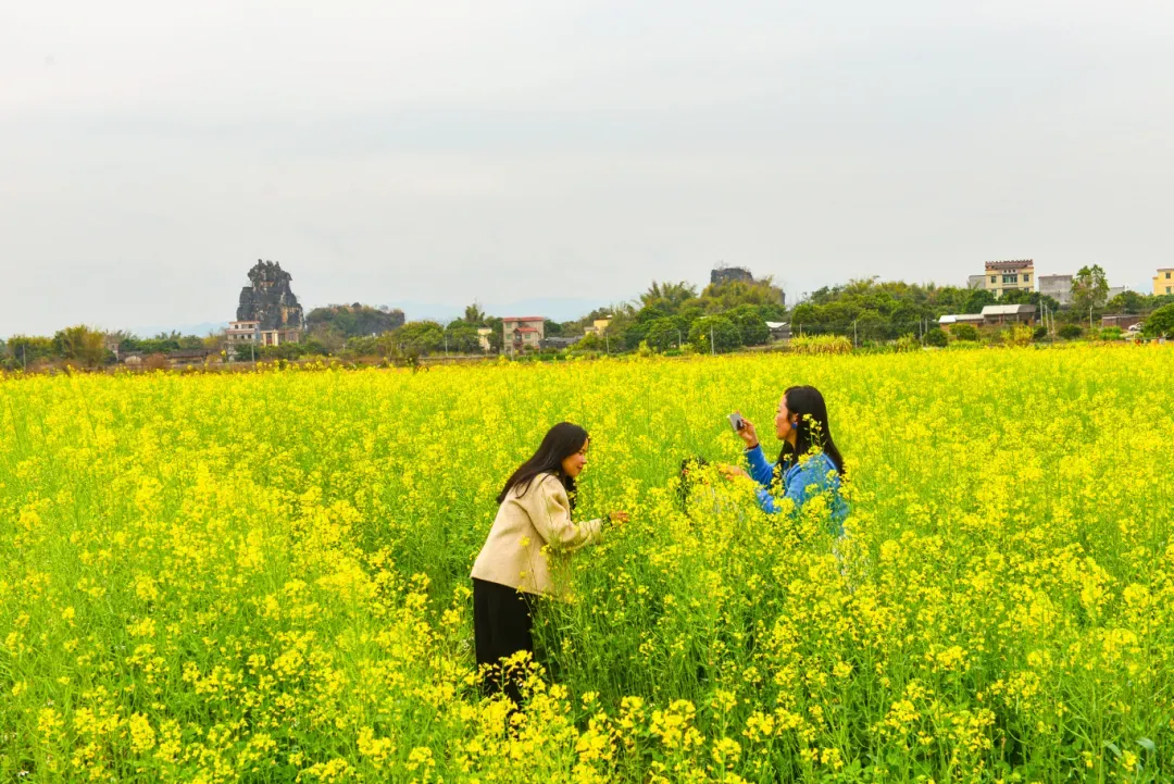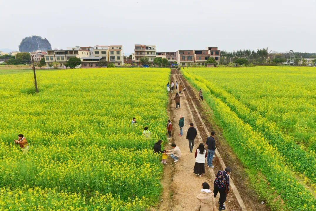 春节期间,阳光正好,微风不燥,怀集乡村游也成为市民游客的热门选择。在梁村镇花石村、大岗镇富楼村等地的广袤田野上,连片的油菜花正值盛放期,微风拂过,花浪翻涌,蜂蝶共舞。游客们三五成群徜徉于金色花海,孩子们在田埂上追逐嬉戏,清脆的笑声在田野上空回荡。