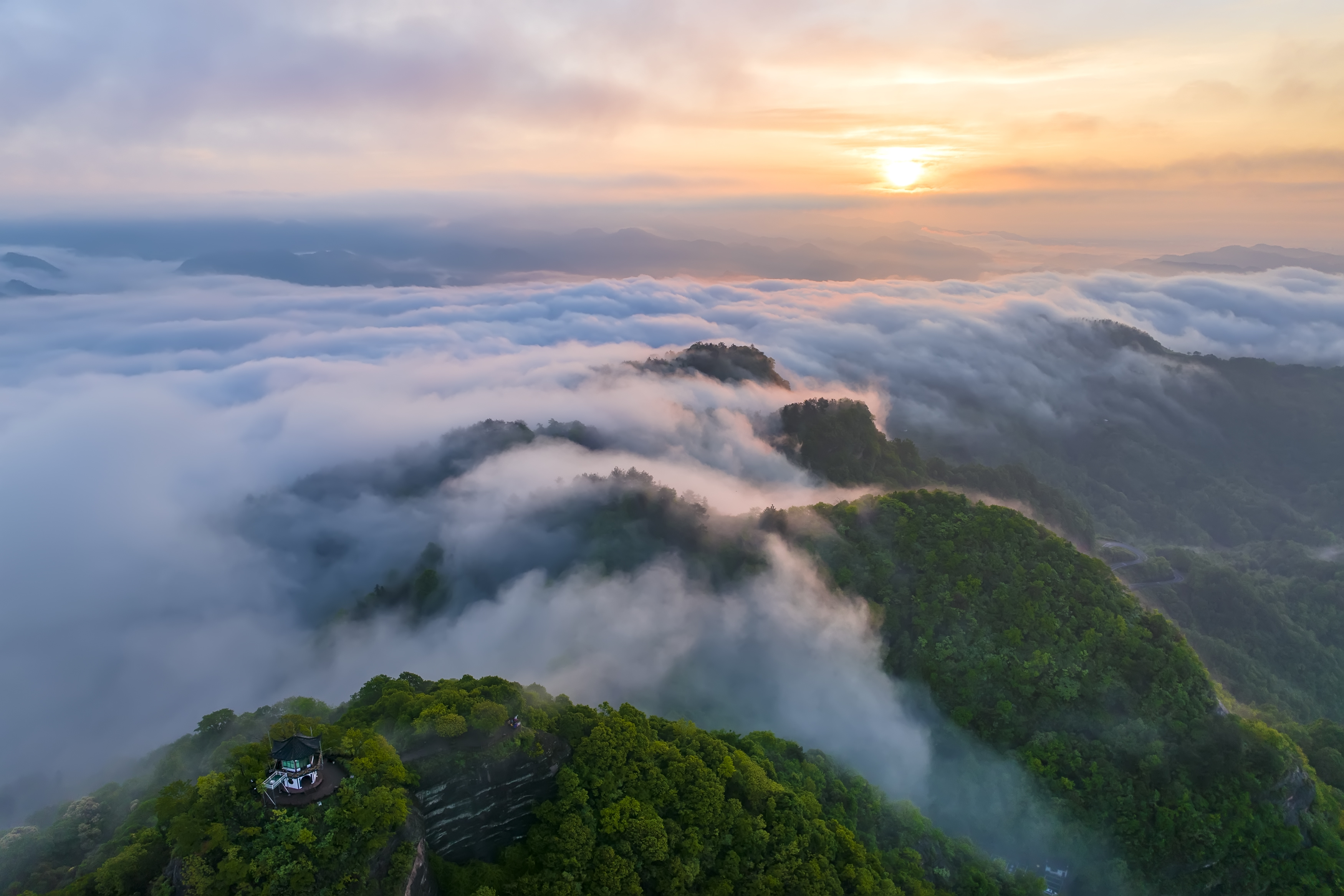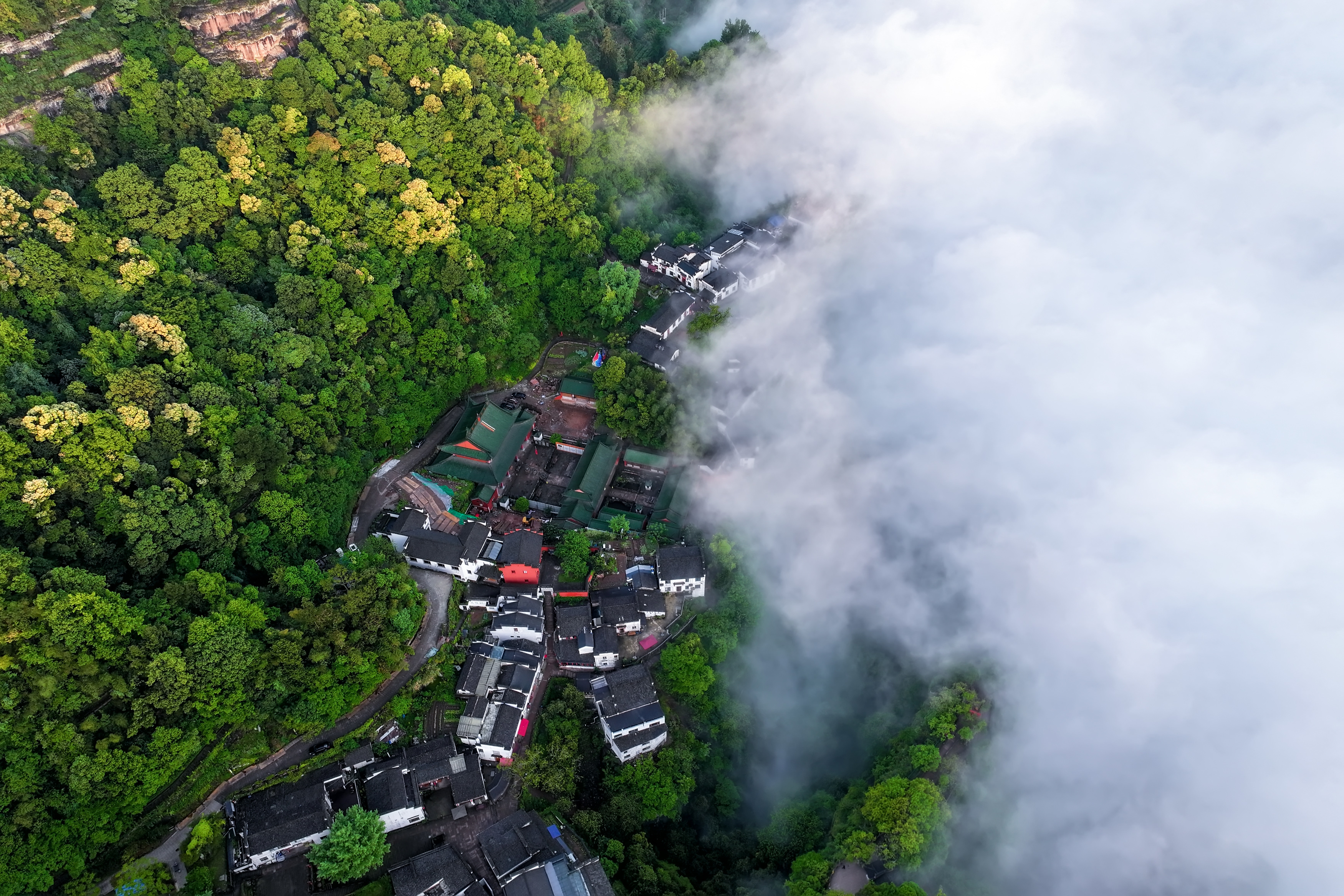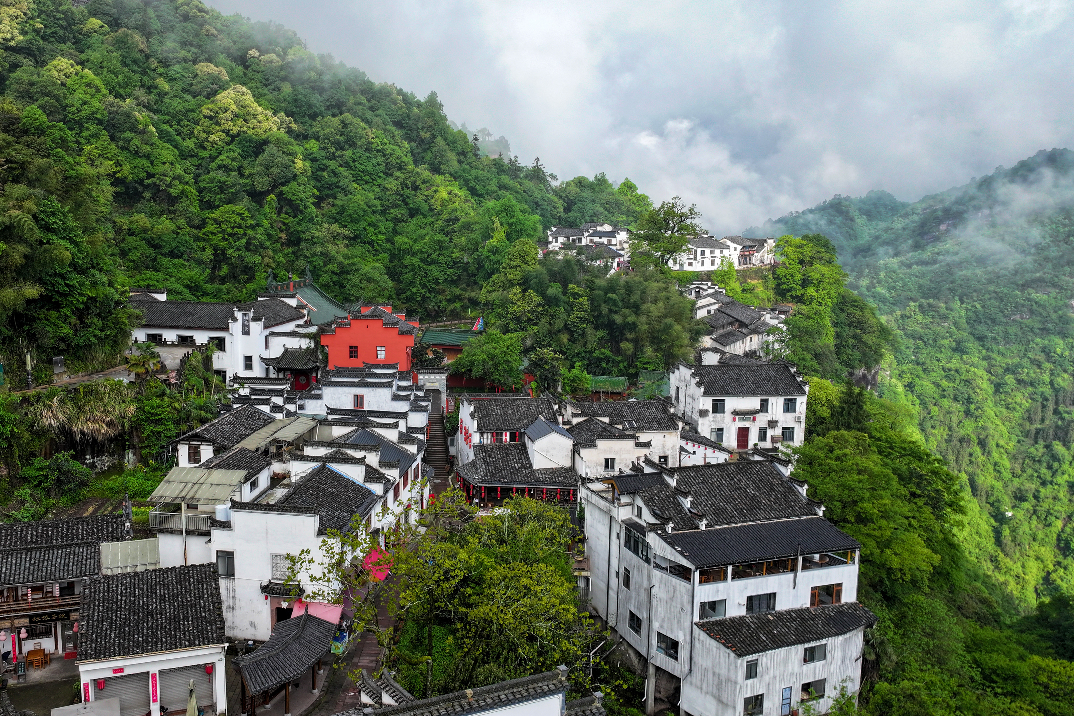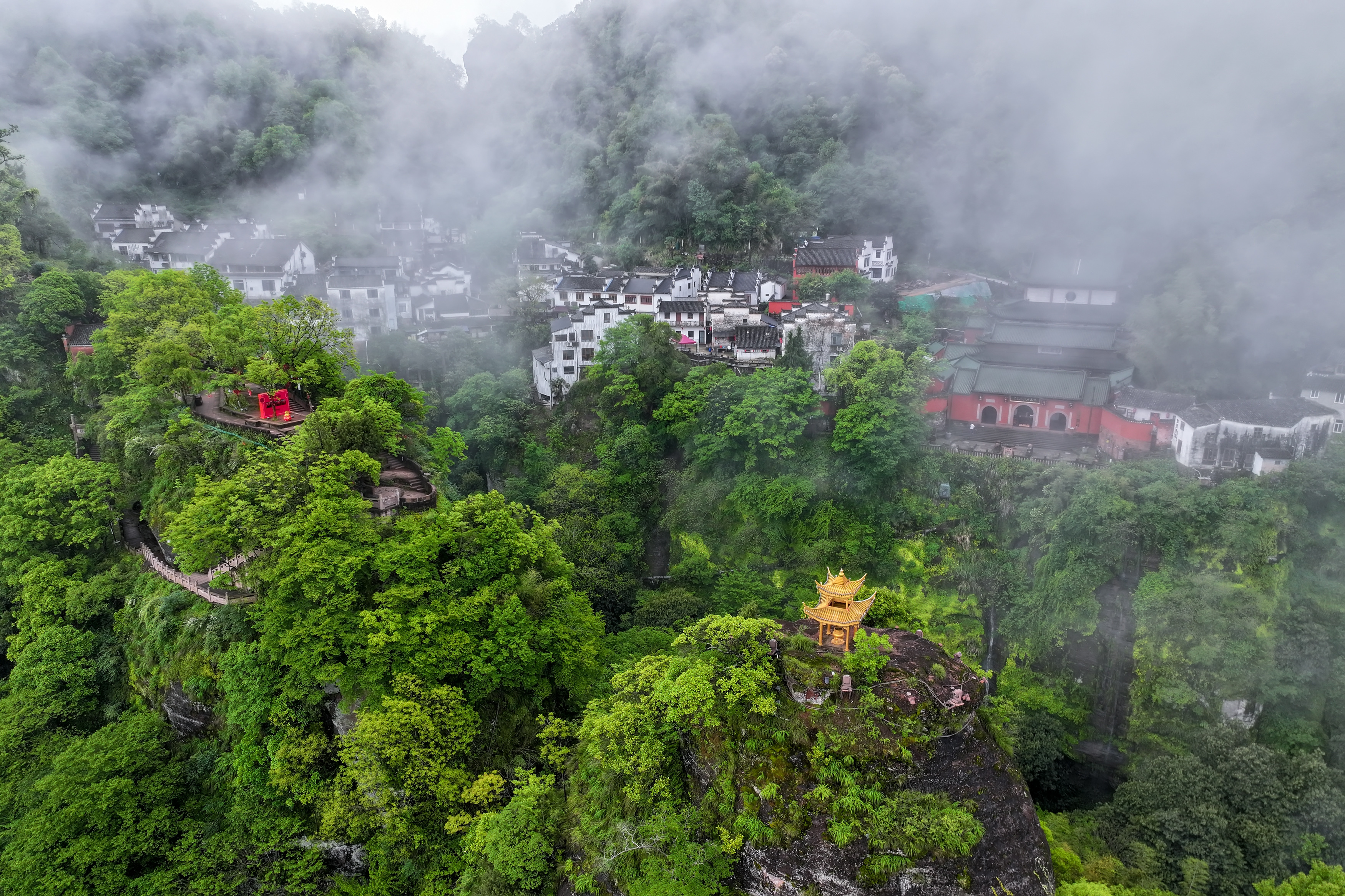 4月30日,雨后初霁的安徽省黄山市休宁县齐云山景区云雾升腾,徽派民居与山峦在云雾中若隐若现,美如画卷(无人机照片)。新华社发(樊成柱 摄)
